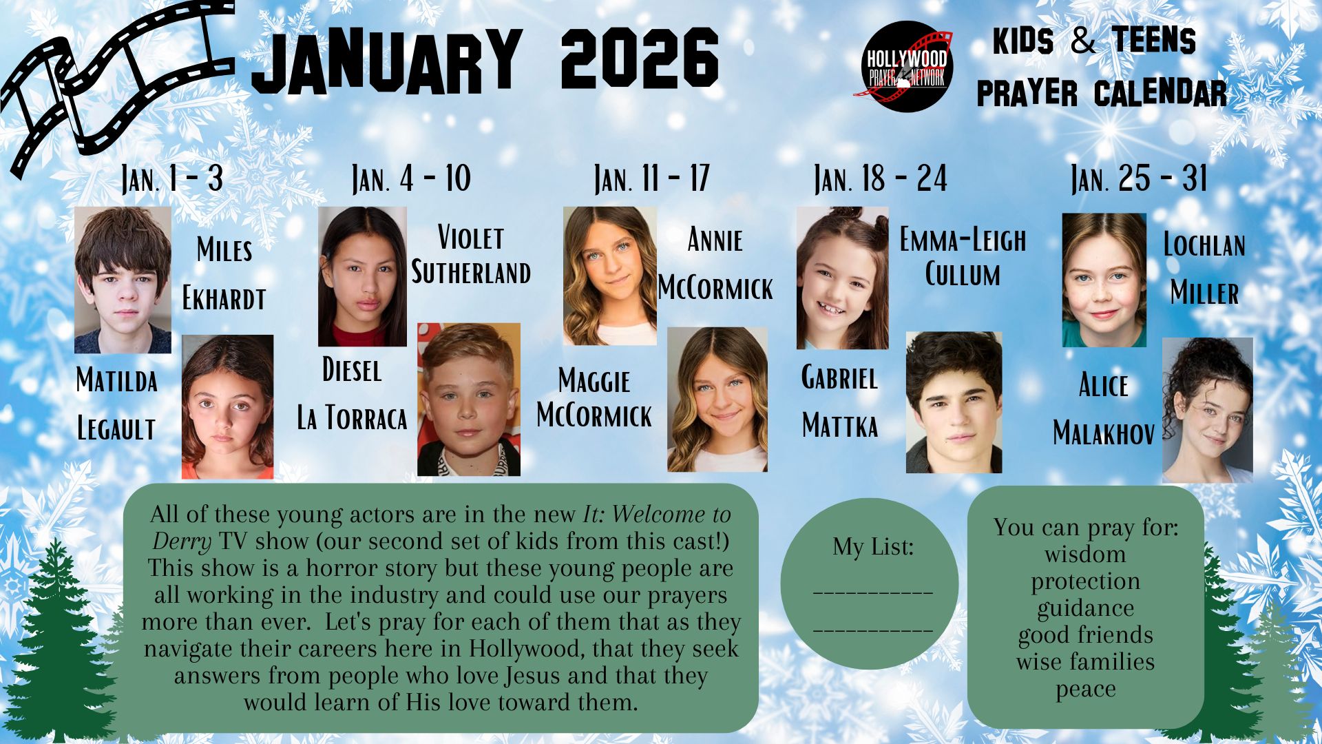 We are excited to include young people, youth pastors and families in our prayers for Hollywood! Join us in praying for those who influence kids in film, television and music. Download or print the calendar and pass it on to your families, friends, and youth group leaders so that our young people are encouraged to be praying for their peers as they watch and listen to their favorite films, TV shows and songs.